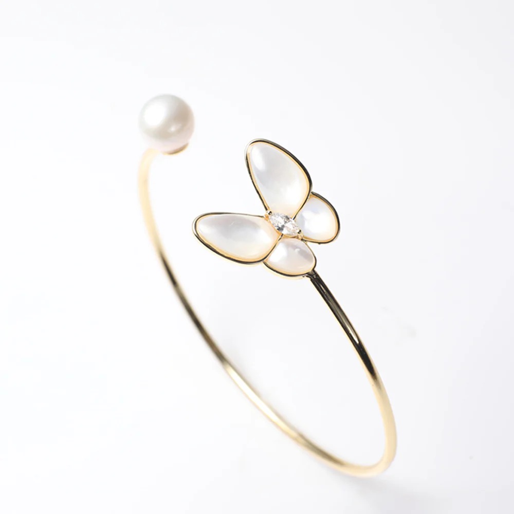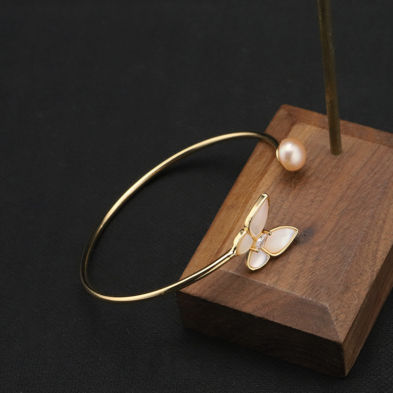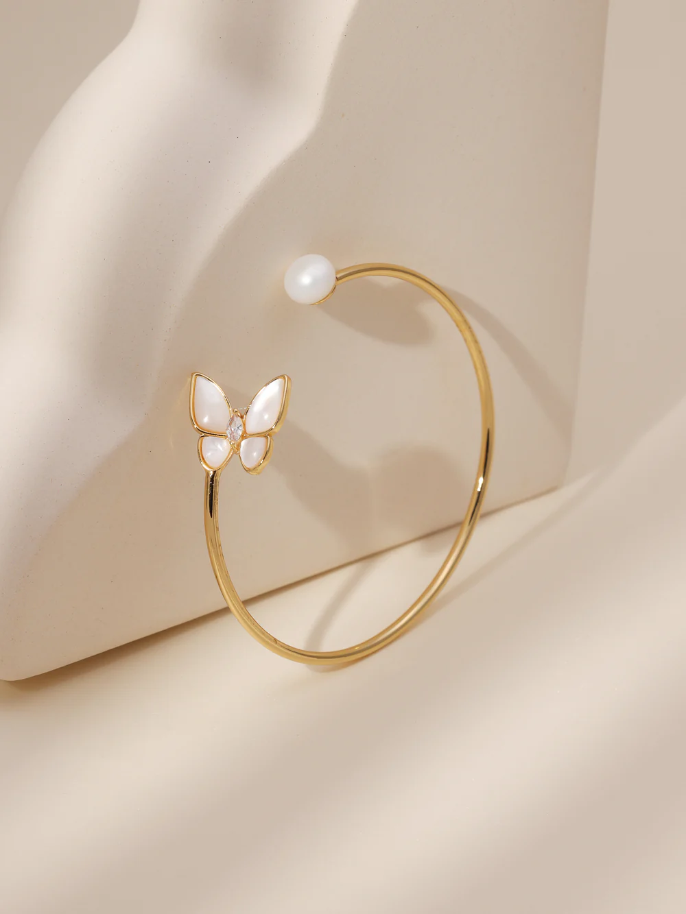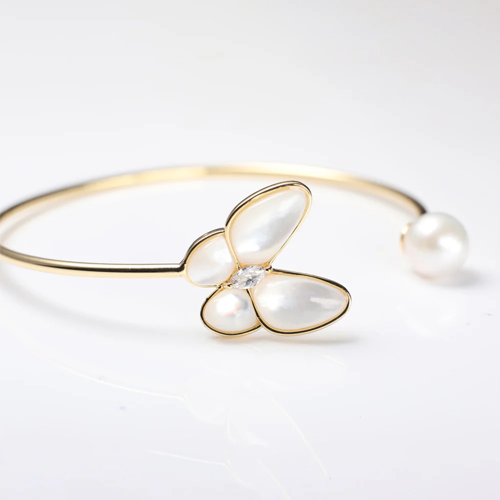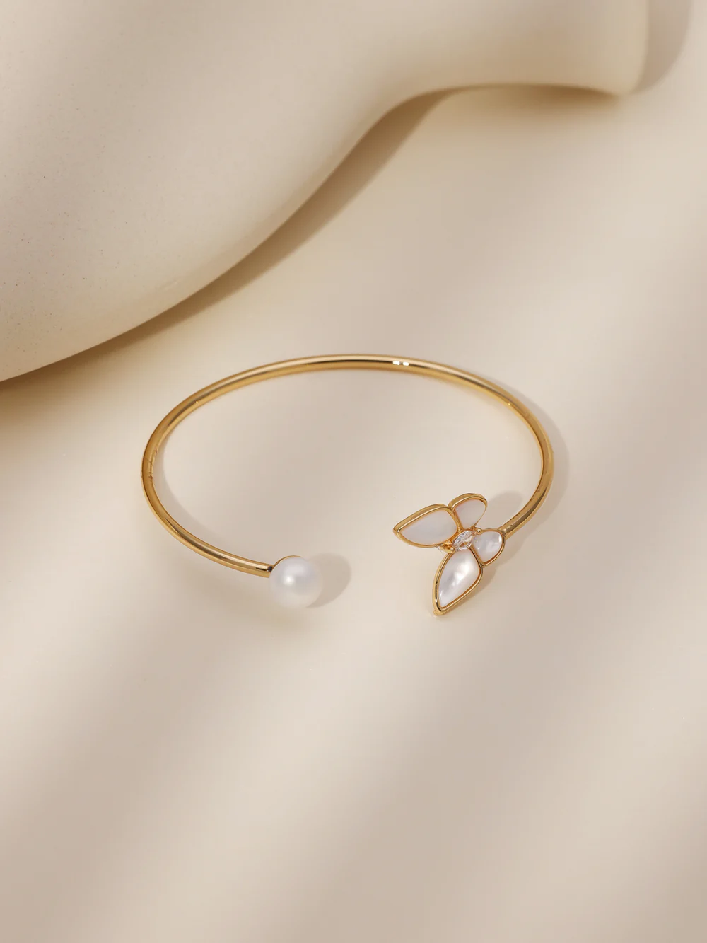 3- این دستبند باریک و باز دارای یک پروانه بلوری با بالهای مروارید سفید در یک سمت و یک مروارید سفید (۱۱ میلیمتر) در سمت دیگر است.