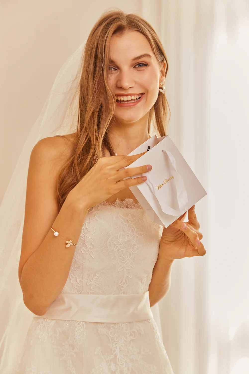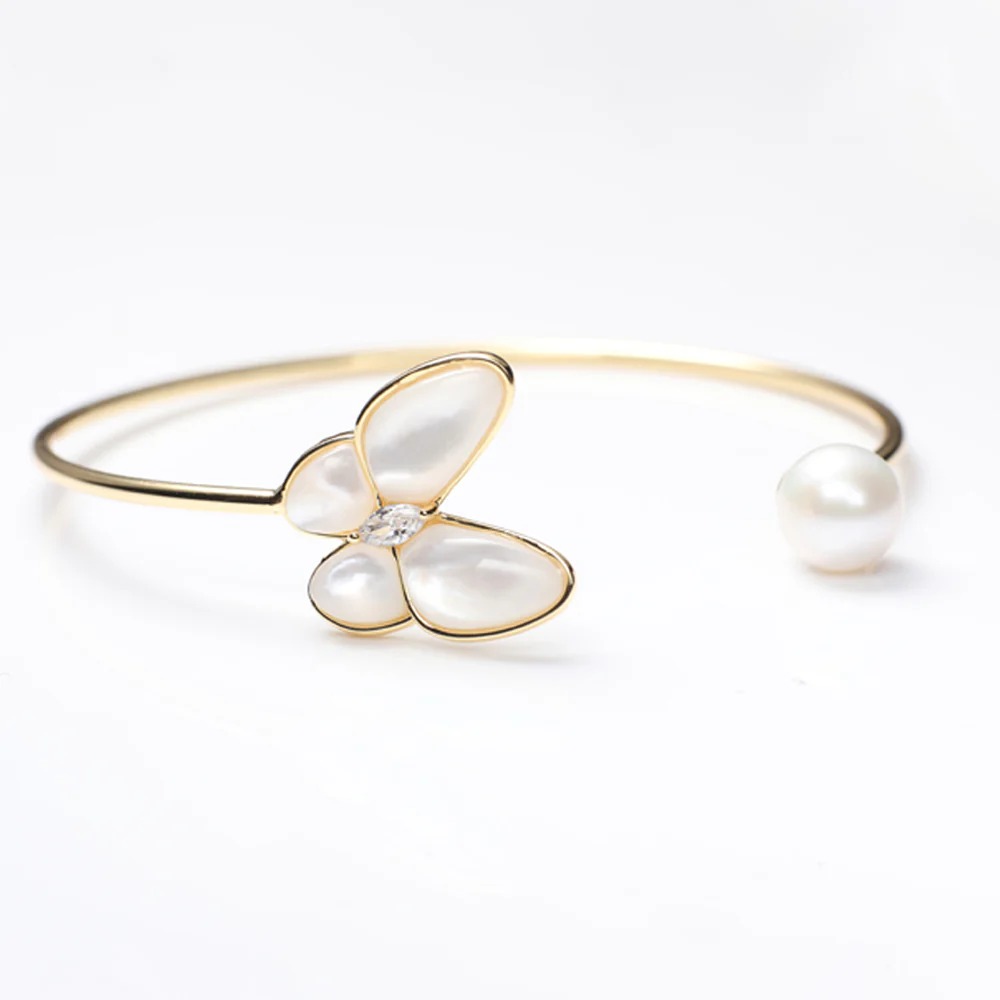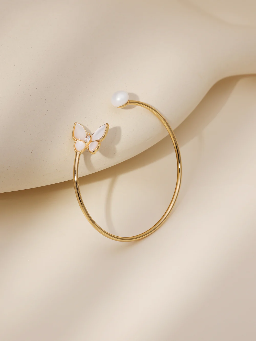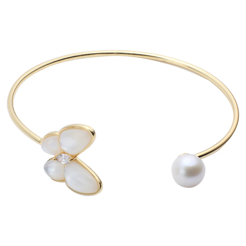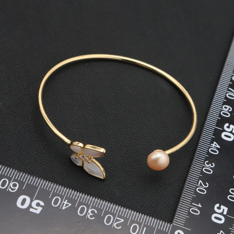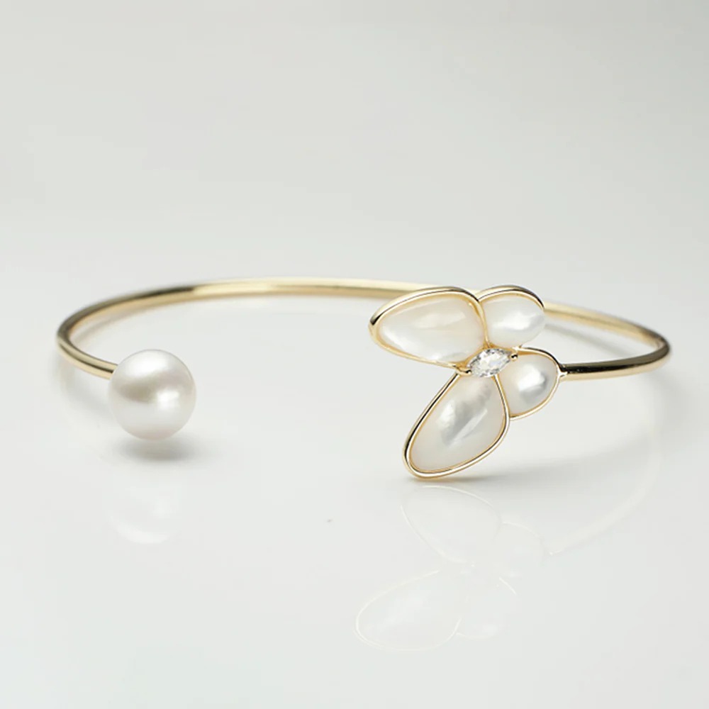 3- این دستبند باریک و باز دارای یک پروانه بلوری با بالهای مروارید سفید در یک سمت و یک مروارید سفید (۱۱ میلیمتر) در سمت دیگر است.